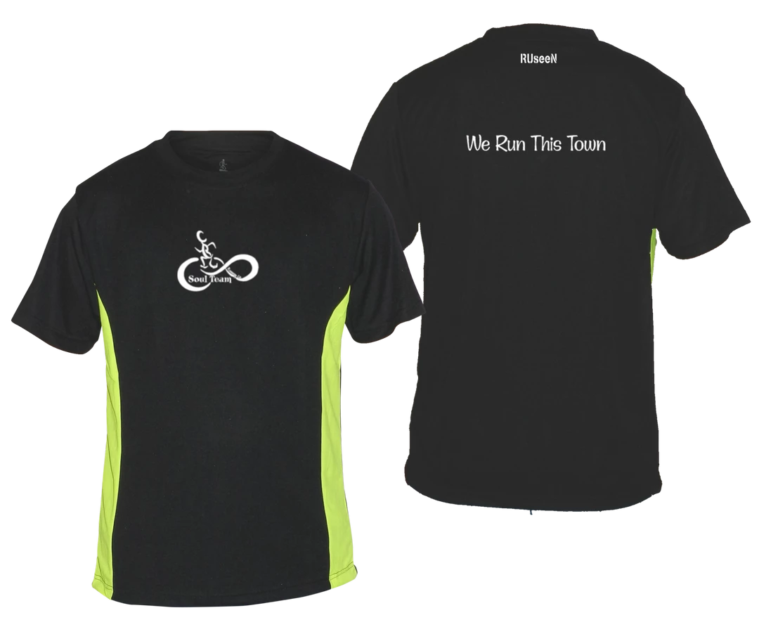 Men’s reflective short sleeve shirt. 100% polyester, moisture wicking, breathable, uv-protection, colorfast with zero shrinkage. Front:Â Soul Team Running Co logo Back:Â We Run This Town