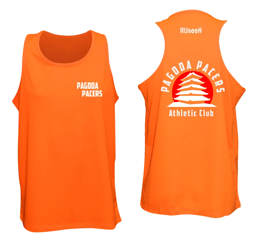 Men’s reflective racerback tank top. 100% polyester, moisture wicking, breathable, uv-protection, colorfast with zero shrinkage. Front: Pagoda Pacers Back: Pacers logo