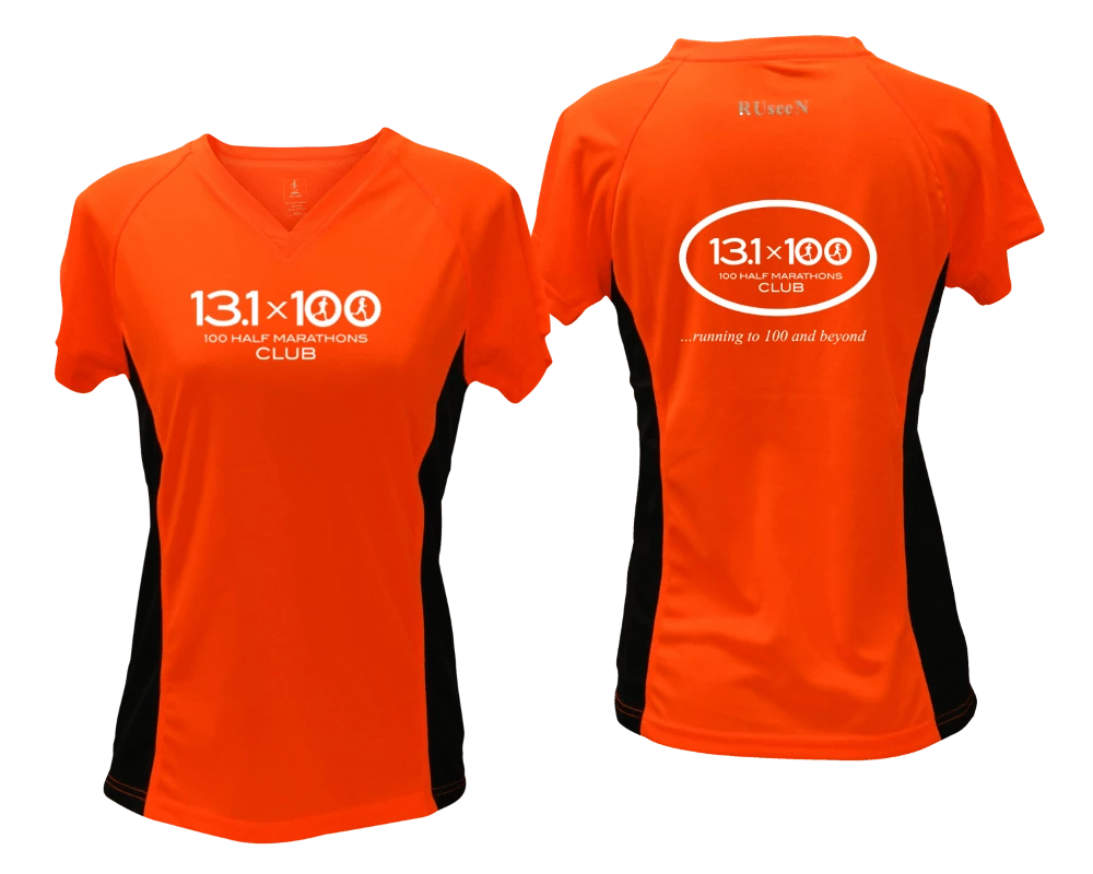 Women’s reflective short sleeve shirt. 100% polyester, moisture wicking, breathable, uv-protection, colorfast with zero shrinkage. Front: 100 Half Marathons Club logo Back: 100 Half Marathons logo