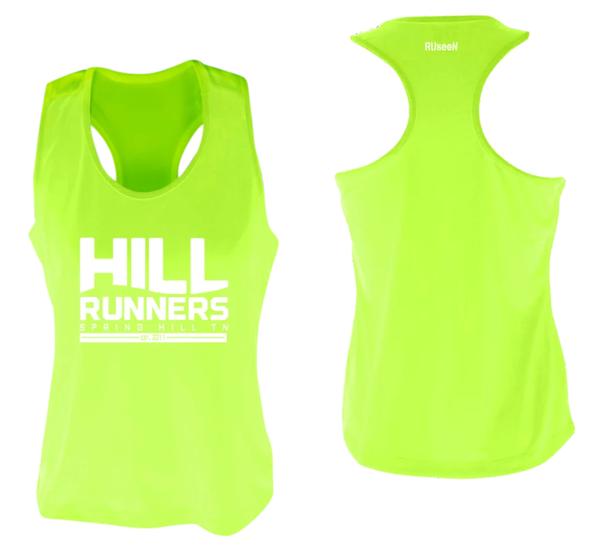 Women’s reflective tank top shirt. 100% polyester, moisture wicking, breathable, uv-protection, colorfast with zero shrinkage. Front: Hill Runners TN Logo Back: blank