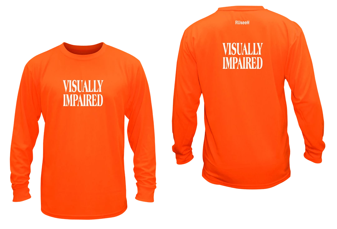 If you’d like an alternative to our reflective Visually Impaired running vest we now offer long sleeve shirts with your choice of reflective or black text front and back.  The comfortable polyester shirts aren’t just for athletes, they’re great for everyday wear any time or place you may need to make the public passively aware of you. We’ve offered it in our two most popular colors, if you’d like some other options please email us for availability.