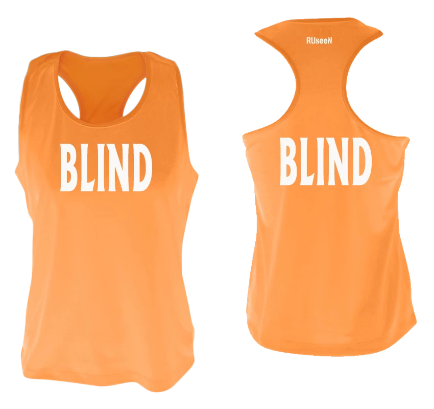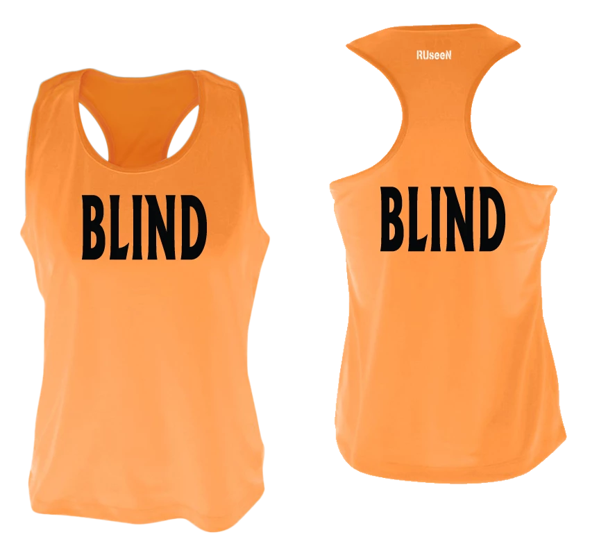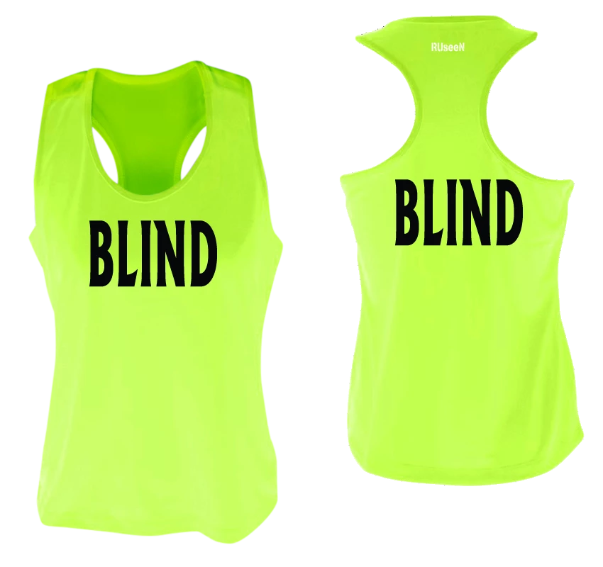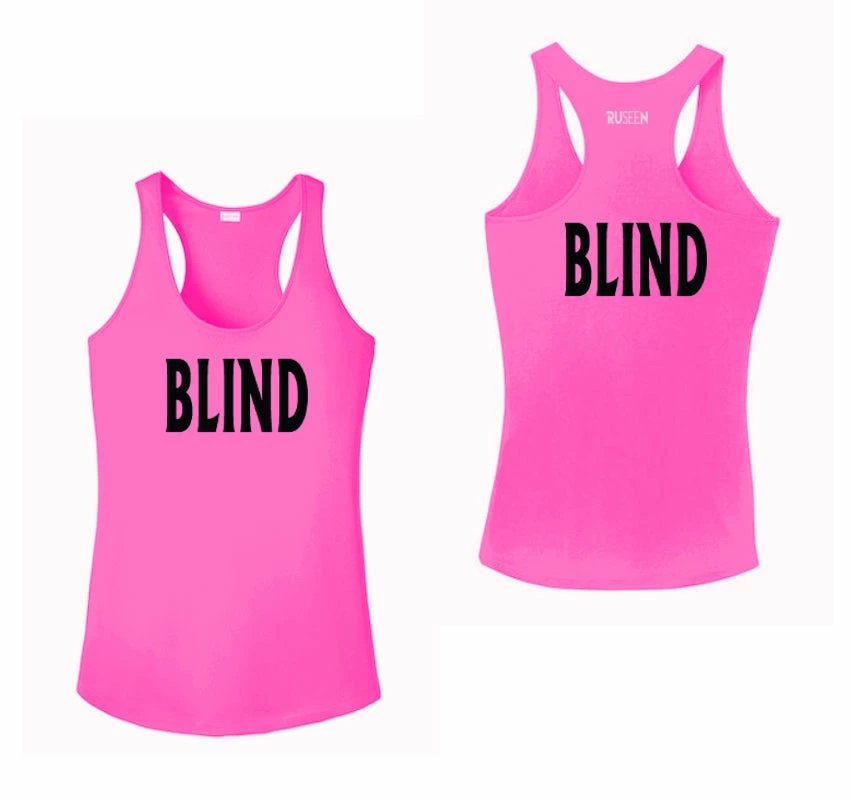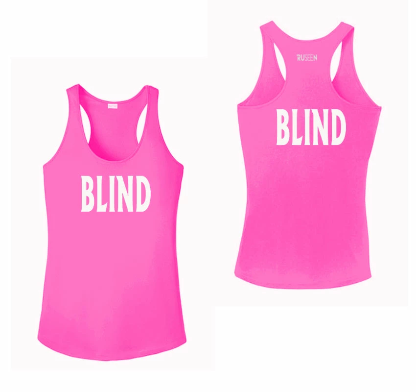 If you’d like an alternative to our reflective Blind running vest we now offer tank tops with your choice of reflective or black text front and back.  The comfortable polyester shirts aren’t just for athletes, they’re great for everyday wear any time or place you may need to make the public passively aware of you. We’ve offered it in our 3 most popular colors, if you’d like some other options please email us for availability. Neon Pink is a smooth finish fabric. Orange & Lime Yellow are a textured knit fabric with a looser fit.