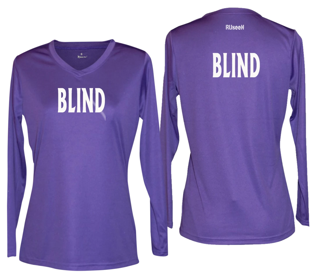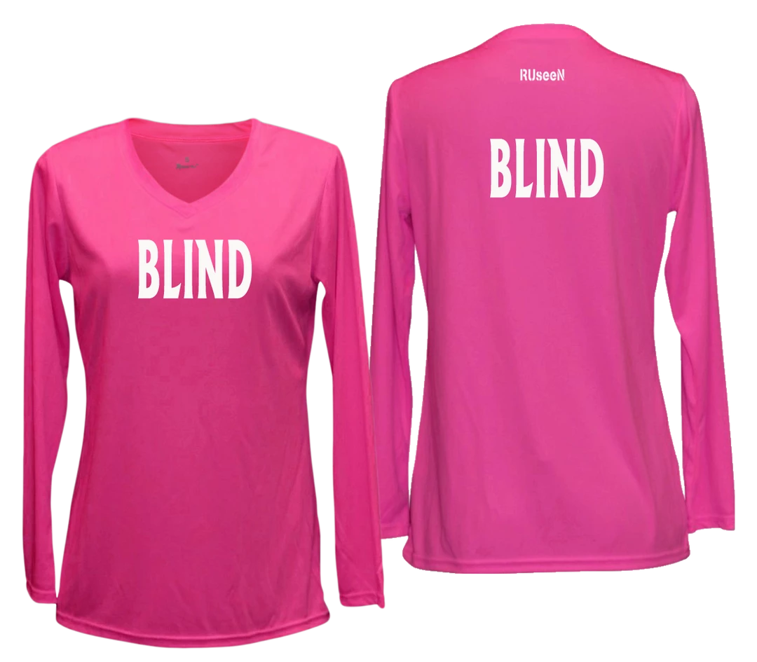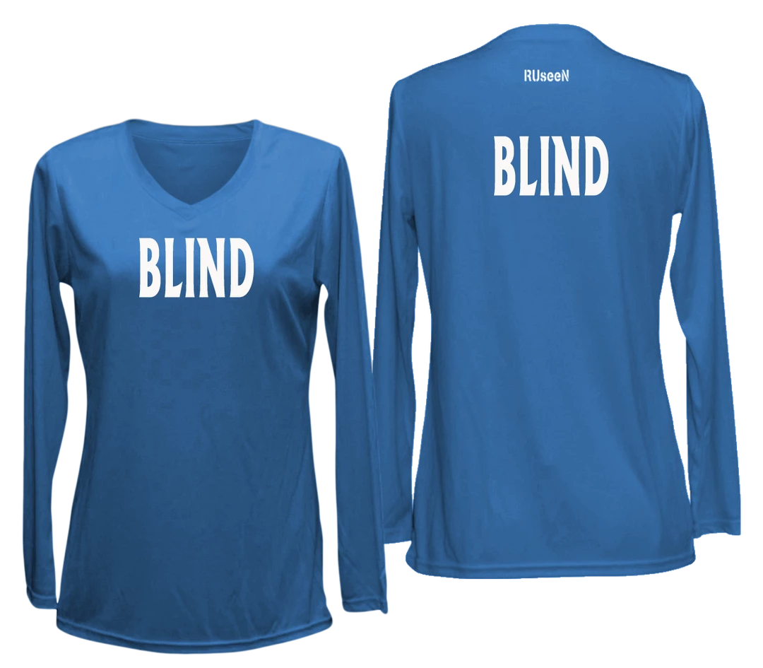 If you’d like an alternative to our reflective Blind running vest we now offer long sleeve shirts with your choice of reflective or black text front and back.  The comfortable polyester shirts aren’t just for athletes, they’re great for everyday wear any time or place you may need to make the public passively aware of you. We’ve offered it in 3 of our most popular colors, if you’d like some other options please email us for availability.