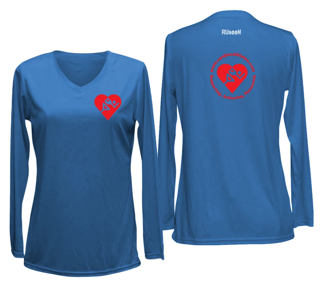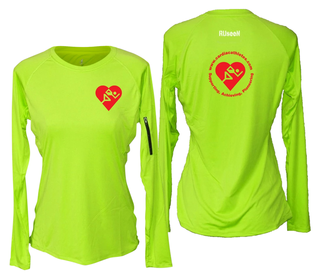Logo use permitted by cardiacathletes.org. We now offer women’s long sleeve shirts with your choice of reflective or red logos front and back.  Please note that the version with the red logo is NOT Reflective, it’s only high vis for daytime.