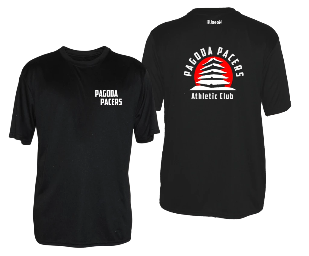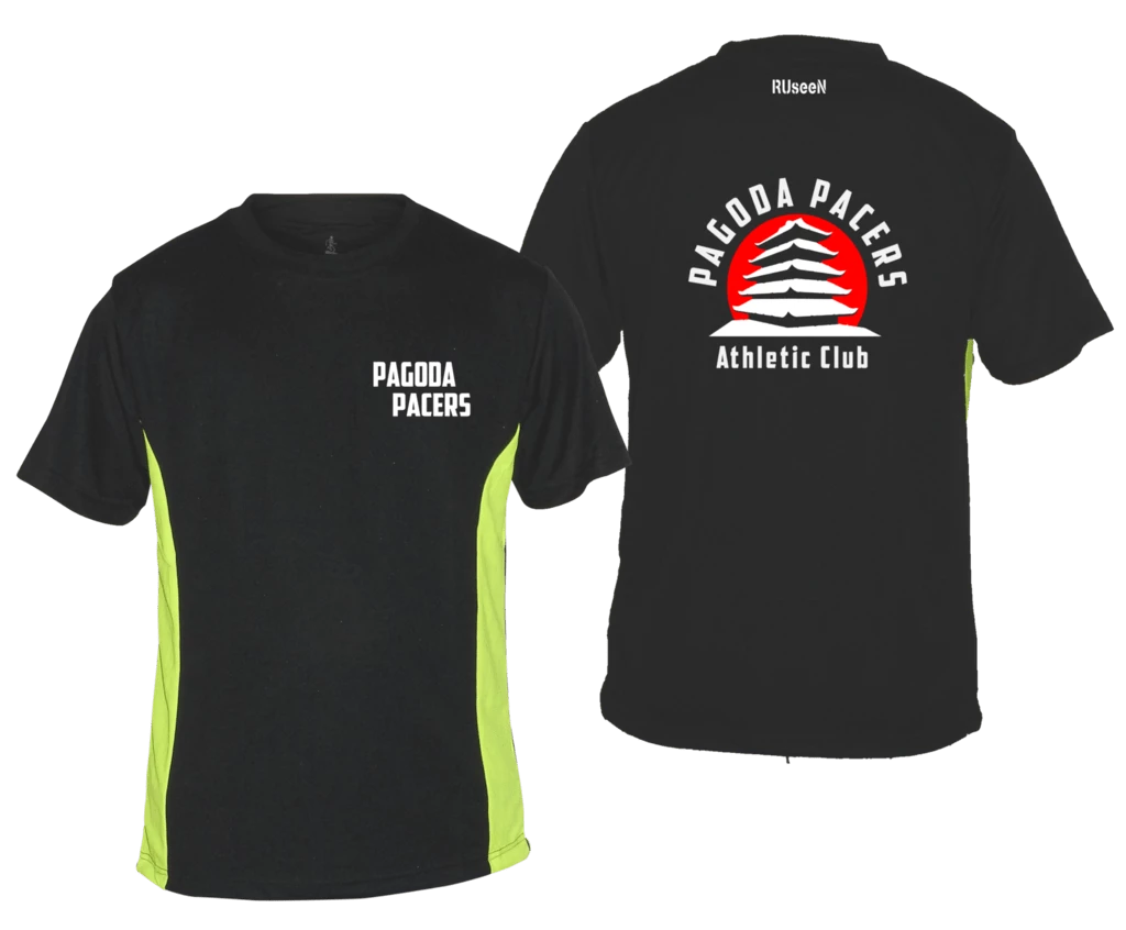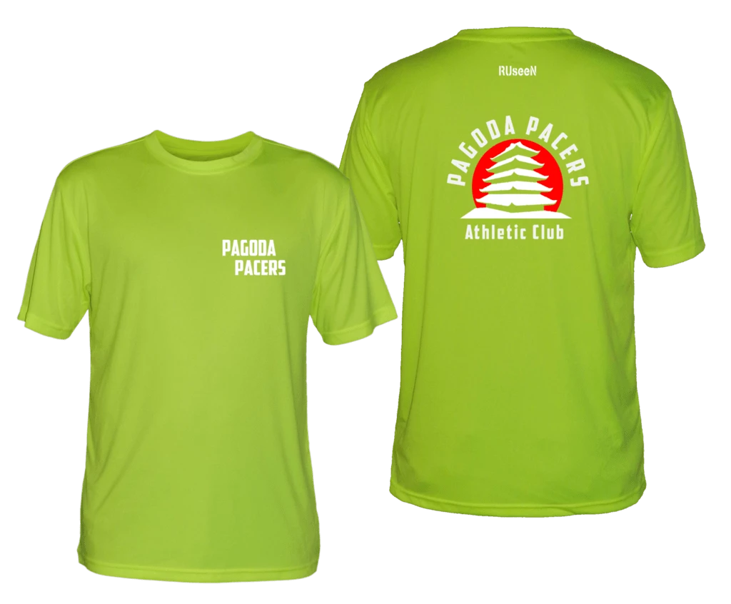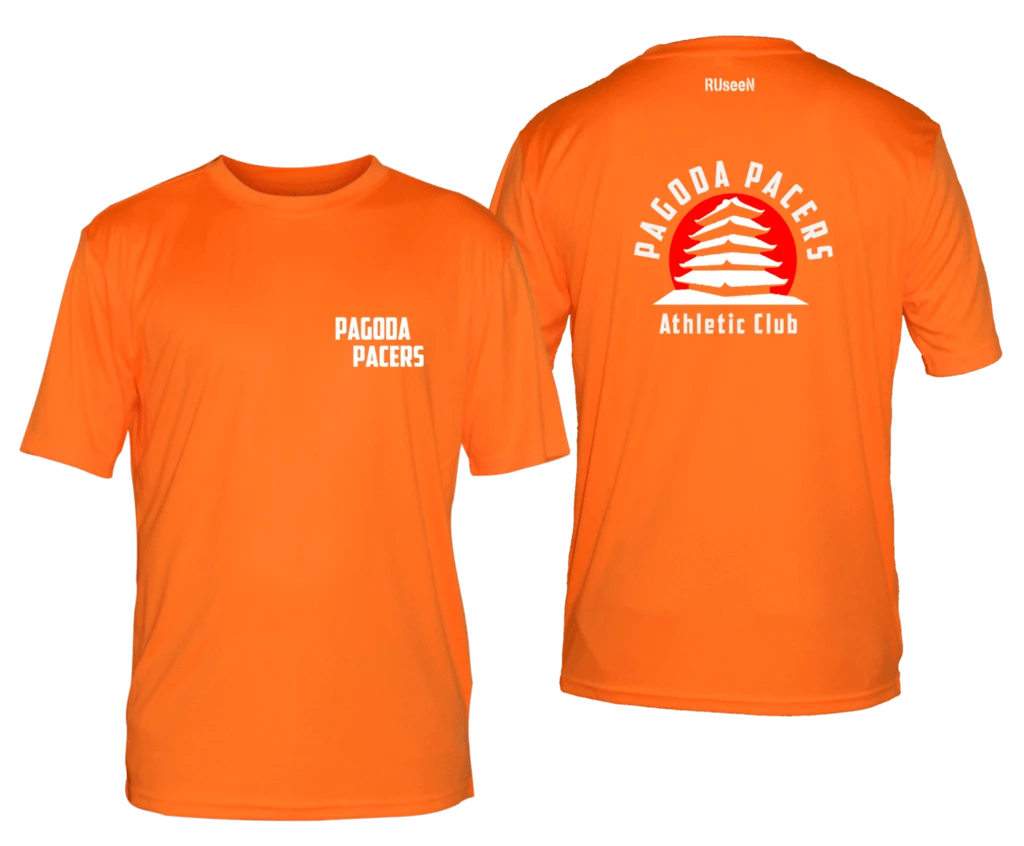 Men’s reflective short sleeve shirt. 100% polyester, moisture wicking, breathable, uv-protection, colorfast with zero shrinkage. Front: Pagoda Pacers Back: Pacers logo