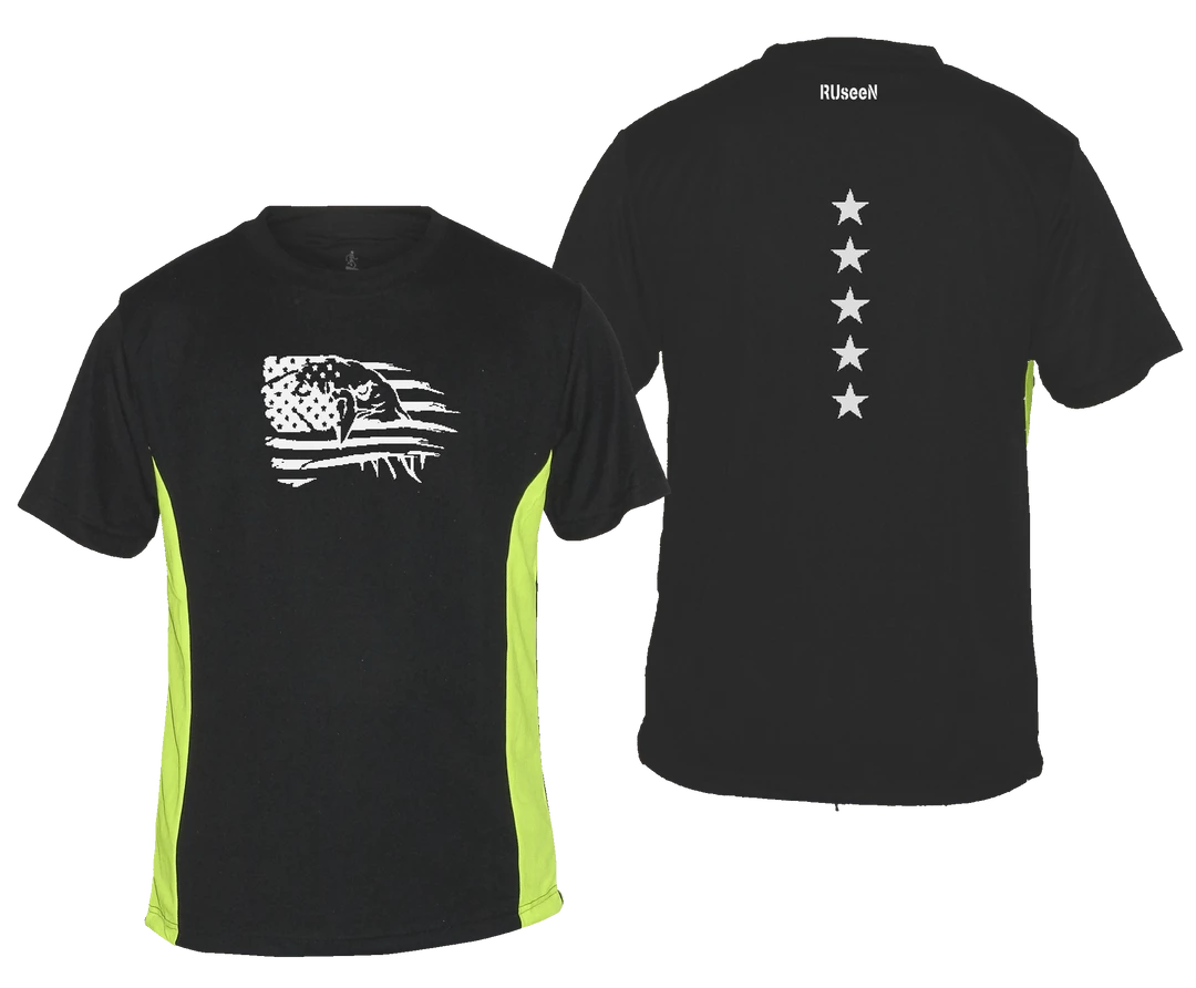 Share your American spirit in our new men’s short sleeve shirt. The large eagle flag front & line of stars on the back are highly visible for parades, rides, runs and any event celebrating our patriotism and supporting our veterans. Â