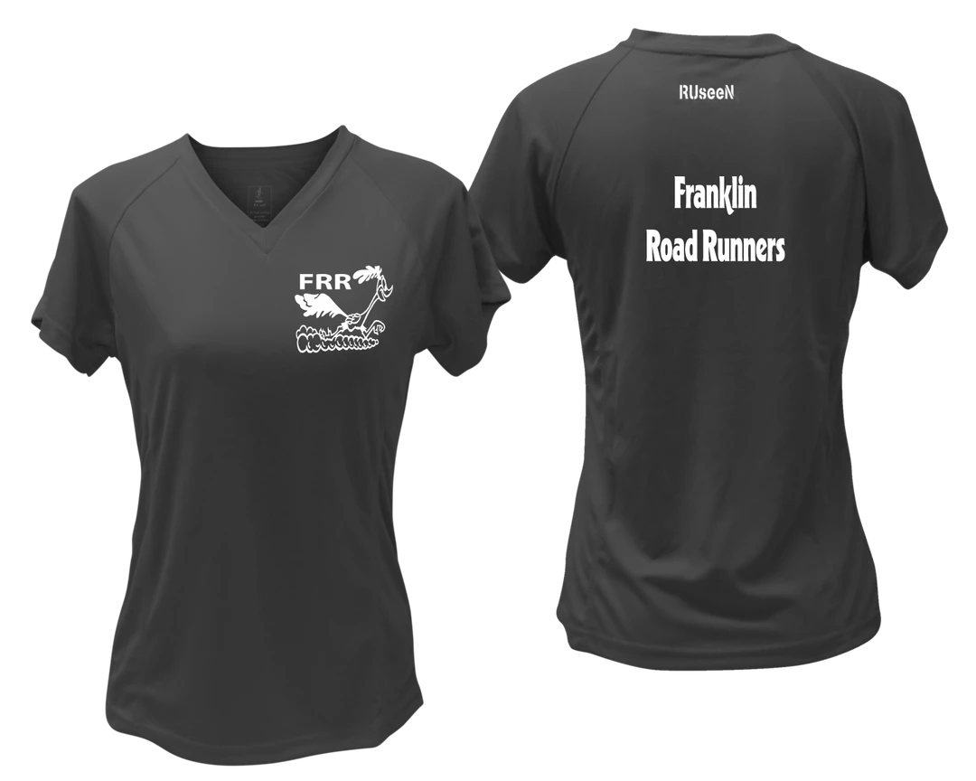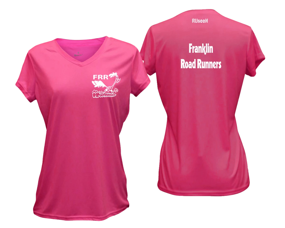 Women’s reflective short sleeve shirt. 100% polyester, moisture wicking, breathable, uv-protection, colorfast with zero shrinkage. Front: Franklin Road Runners Logo Back: Franklin Road Runners