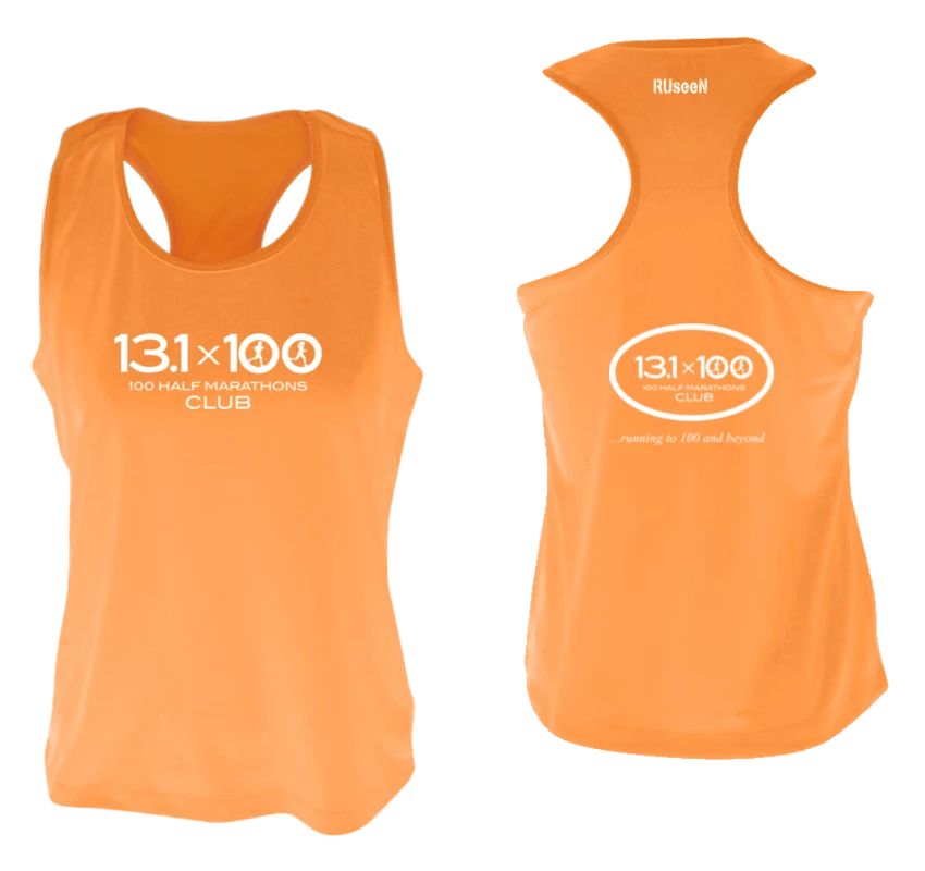 Women’s reflective tank top. 100% polyester, moisture wicking, breathable, uv-protection, colorfast with zero shrinkage. Front: 100 Half Marathons Club logo Back: 100 Half Marathons logo